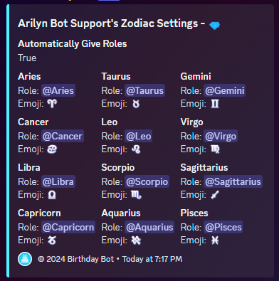 Servers are now able to set custom zodiac roles which the bot will give to users periodically, as well as at certain specific events. For the bot to give the roles, the `AutomaticallyGiveRoles` setting must be enabled, don't worry, by default it already is!&#x20;