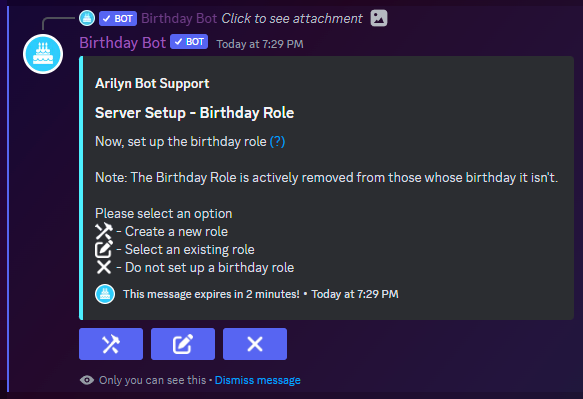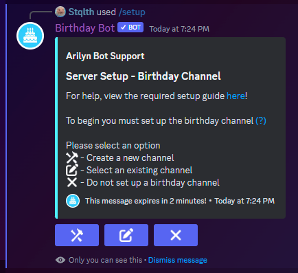 You now have three options to choose from to set your birthday channel. The first will automatically generate the default birthday channel; the second will allow you to choose from your server's current channels; and the third will skip setting a birthday channel.