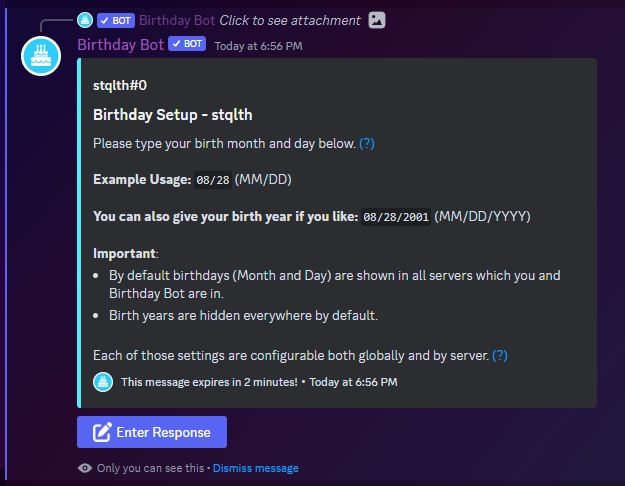 Now, Birthday Bot will prompt you to put your Birth Month & Date as well as the option to add your birth year.